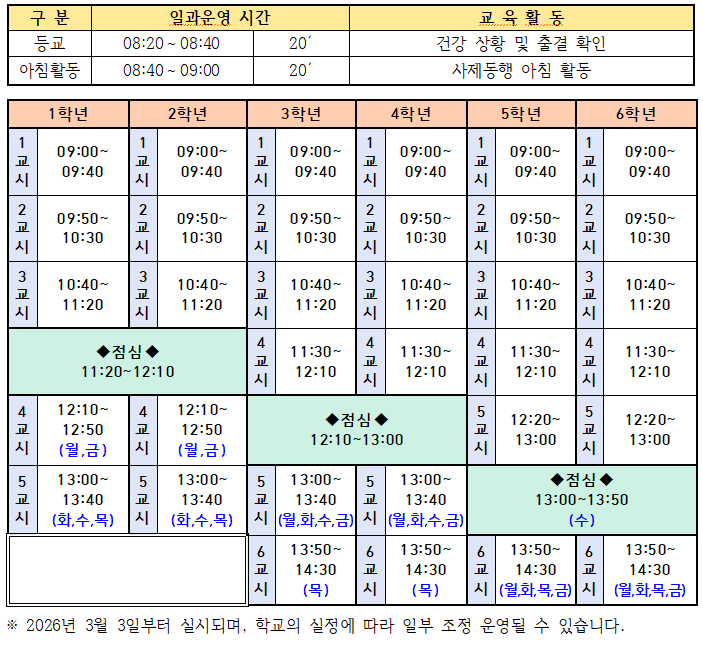 원활한 현동교육과정 운영을 위해 다음과 같이 2026학년도 일과 운영을 다음과 같이 실시하고자 합니다. 아래의 일과 운영을 확인하시어 자녀의 등·하교 시간에 차질이 없도록 협조하여 주시기 바랍니다.