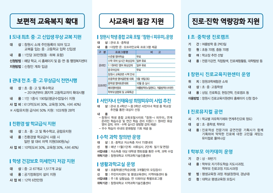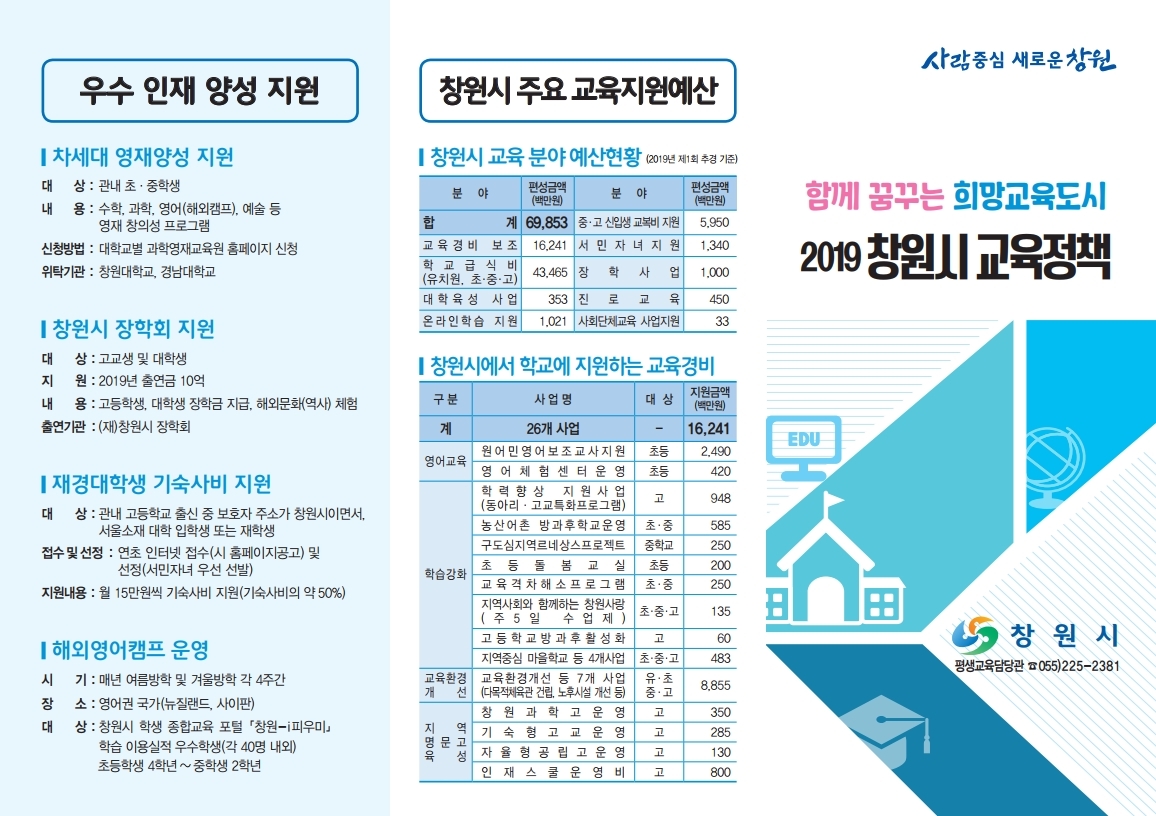 2019 창원시 교육정책(창원시 주요 교육 지원 예산 및 학교에 지원하는 교육경비 등)을 안내합니다.