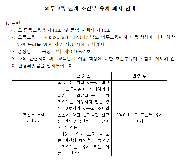 의무교육단계 조건부 유예 폐지 안내