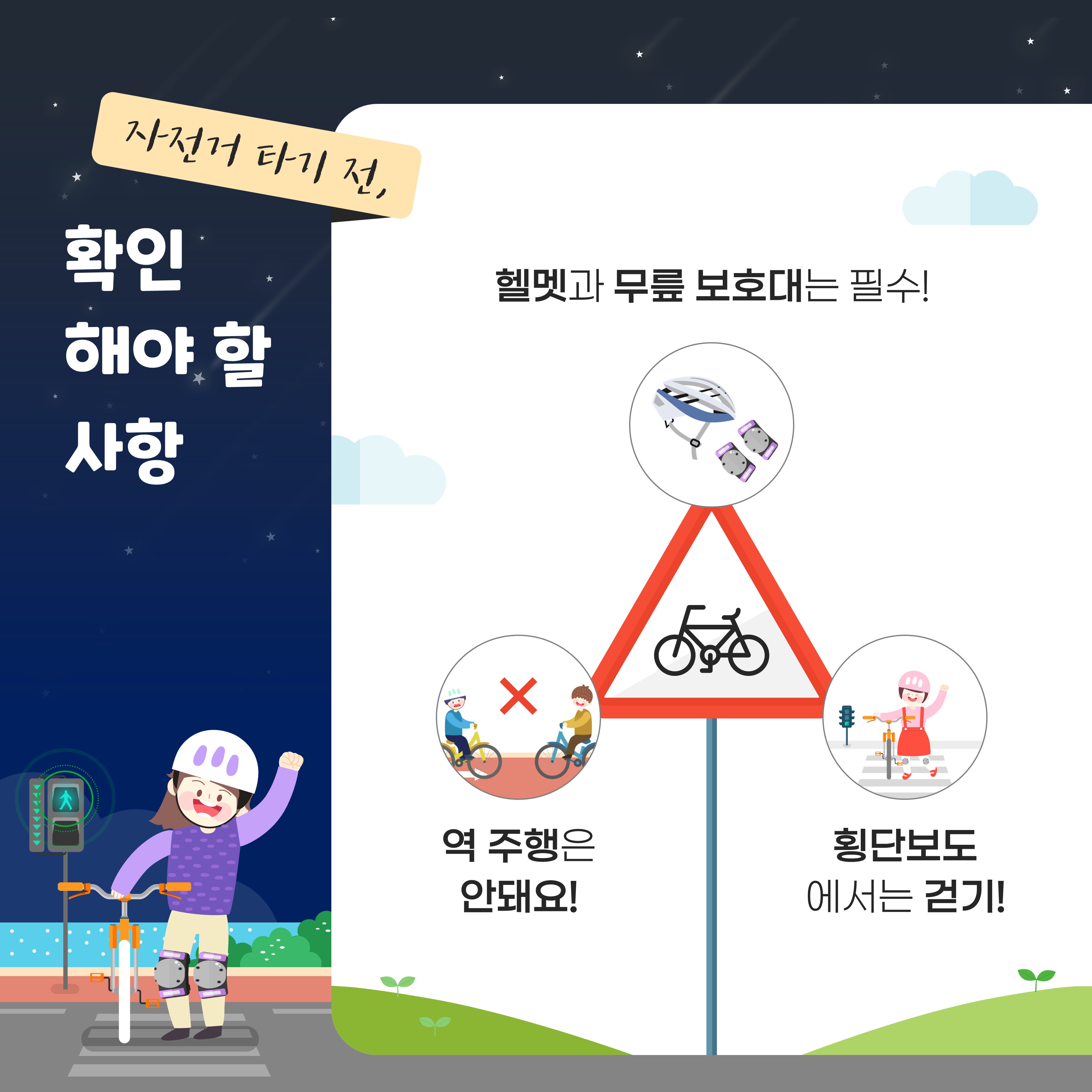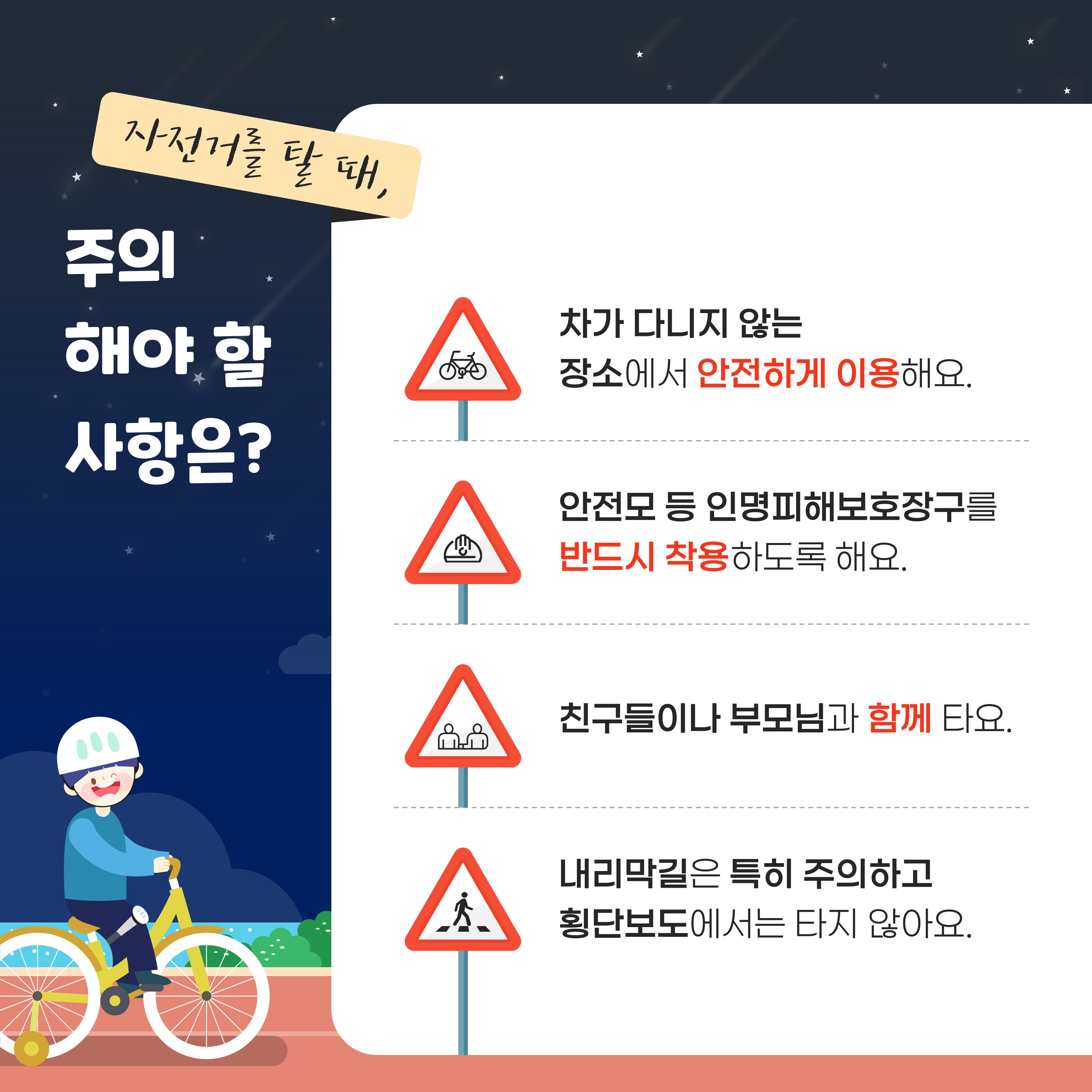 자전거를 안전하게 타는 방법을 안내해드리오니 참고하여 안전하고 즐겁게 자전거를 탈 수 있도록 생활화합시다. 감사합니다.