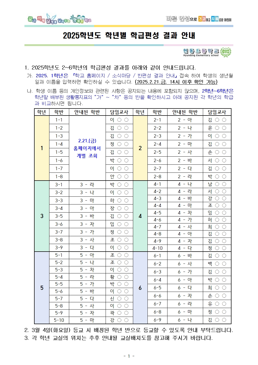 2025학년도 2학년~6학년의 학급편성 결과를 안내드립니다.